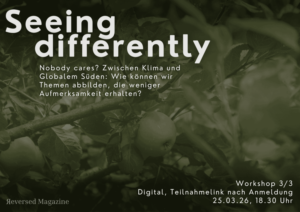 - Nobody cares? Zwischen Klima und Globalem Süden am 25.03.2026 um 18.30 Uhr: Wie können wir Themen abbilden, die weniger Aufmerksamkeit erhalten? Wir besprechen gemeinsam die Möglichkeiten von ethischer visueller Erzählung von Themen mit geringer medialer Präsenz, die Komplexität und Ambivalenz sichtbar machen, ohne zu moralisieren oder koloniale Narrative zu reproduzieren. Denn während die ganze Welt überproportional auf die USA schaut, sind andere Themen medial und öffentlich schlicht vergessen.